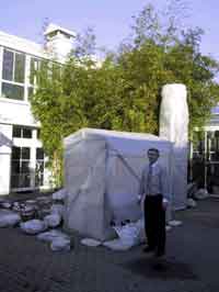 Geisterhäuschen im Garten. Bambus in der Umgebung. Holzgerüste und Luftpolsterfolien. Eine erprobte Technik verhelfen der Faserbanane Musa basjoo in einem Garten in Ettlingen (Baden) zu wahrlichen Glanzleitungen. Anfang November wird eingepackt, die Blätter entwickeln sich im Februar, Ende Februar wachsen diese Stauden bereits derart, dass im März das Basjoo-Haus erhöht werden muss. Wie ? Hochschieben - unten dicht machen - fertig.